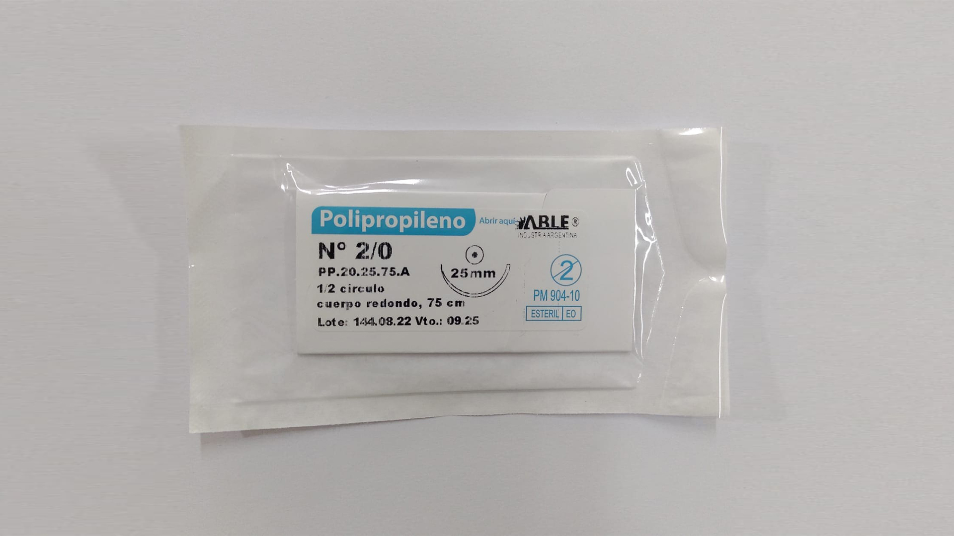 La sutura de Polipropileno es un monofilamento no absorbible, compuesto por una poliolefina lineal. Su estructura inerte y lisa confiere una alta resistencia a la tracción y mínima reacción inflamatoria. Es especialmente útil en heridas contaminadas o infectadas, ya que minimiza la formación de fístulas o extrusión del hilo.